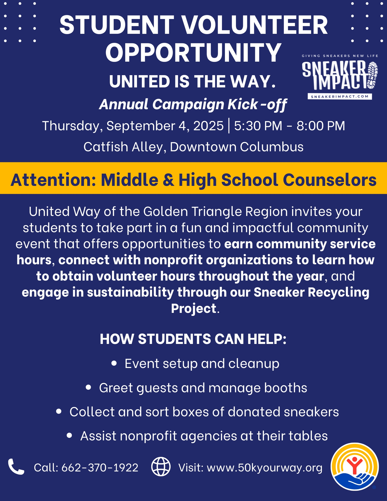 Calling all enthusiastic volunteers to our United is the Way: Annual Campaign Kick-off! We need volunteers to setup and breakdown the event, greet guests and manage booths, collect and sort boxes of donated sneakers, and assist nonprofit agencies at their tables. Sign up here.